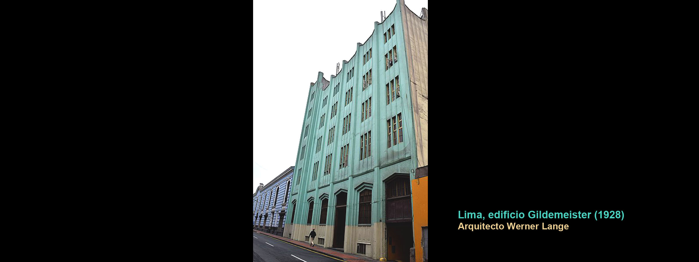 El autor estudia el caso del edificio Gildemeister para referirse al estado del análisis y difusión del inmueble, destacando la importancia que posee por ser el primer edificio Art Deco construido en Lima, además declarado por el Instituto Nacional de la Cultura, como Patrimonio Cultural de la Nación en la categoría de Monumento. Fue proyectado por el reconocido arquitecto alemán Werner Lange y construido en 1928, quien realizó además las Escuelas Climáticas del Puericultorio Pérez Araníbar en 1929, y otros tantos proyectos en Colombia. El investigador realiza un estudio diagnóstico para comprender su valor de uso, formal y simbólico, y evaluando además, el grado de difusión de dicho inmueble, considerando importante su difusión no sólo en los reducidos ámbitos académicos, sino también como bien cultural que debe ser divulgado a las masas como patrimonio de su identidad y de una época de su historia, señalando que no basta con estudiar a profundidad y conservar los inmuebles, también se hace necesario, la difusión de su memoria patrimonial.