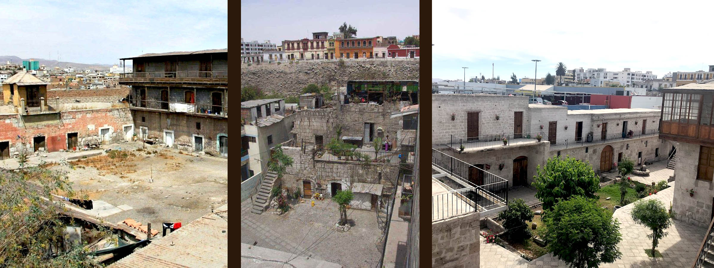 Por: Luis Maldonado Valz (2015). Los tambos de Arequipa, pasado y presente. Arequipa. Patrimonio Cultural de la Humanidad. Reflexiones a los quince años de su declaratoria. Arequipa: Dirección Desconcentrada de Cultura de Arequipa. Ministerio de Cultura, pp. 363-376. Imágenes (de izq. a der.) 1) Tambo de Ruelas; 2) y 3) Tambo de la Cabezona (antes y después de la restauración). El texto presenta las definiciones de tambo, que tienen orígenes prehispánicos, y su replanteamiento a partir de la llegada de los españoles a la región en el siglo XVI. Señala que éstos se situaban al pie de los caminos, como sitios de comercio y arrieraje de productos agrícolas y mineros de la región inmediata. En las proximidades del centro histórico, fueron erigidos más de treinta tambos, de los cuales once de ellos estuvieron en el camino de acceso a la ciudad y conexión con Lima y la costa marítima. El autor sustenta su notable valor patrimonial por la organización espacial, donde el primer nivel se hallaba a la vera del río Chili, mientras que el segundo o tercer piso, estaban enlazados con el puente sobre dicho río. Presenta los proyectos de conservación y gestión de los tambos de Bronce, del Matadero y de la Cabezona, explicando su origen y caracteres generales, así como el resultado de su recuperación, cuya finalidad social estuvo orientada a la mejora de la vida cotidiana de sus habitantes a nivel de servicios básicos, involucrándolos directamente en su salvaguarda. Finaliza reflexionando acerca del positivo impacto social, económico y del entorno urbano contiguo en aquellos que fueron puestos en valor, manifestando la necesidad de recuperar los tambos de las Carmelitas, La Palla y Ruelas, así como la Quinta Salas. LEER EL TEXTO