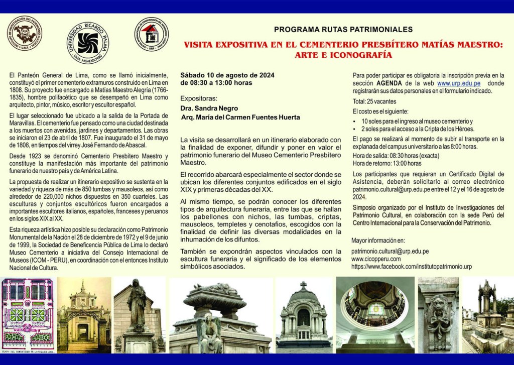 El sábado 10 de agosto de 2024, la sede Perú del Centro Internacional para la Conservación del Patrimonio, con la colaboración del Instituto de Investigaciones del Patrimonio Cultural, dentro de su programa de RUTAS CULTURALES, llevó a cabo una visita expositiva al Cementerio Presbítero Maestro, que constituye la expresión más destacada del patrimonio funerario tanto en el Perú, como en América Latina. Por su riqueza arquitectónica y escultórica, que abarca más de 850 mausoleos, cenotafios y tumbas, así como unos 250,000 nichos dispuestos en varios pabellones o cuarteles, fue declarado Patrimonio Monumental de la Nación el 28 de diciembre de 1972. Años más tarde, el 9 de junio de 1999, la Sociedad de Beneficencia Pública de Lima lo declaró Museo Cementerio a iniciativa del Consejo Internacional de Museos (ICOM – PERU) en coordinación con el entonces Instituto Nacional de Cultura. LEER MÁS