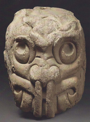 Chavín de Huantar: cabeza clava trasmutada en un ser trascendente. Desde la nariz destila la mucosidad asociada al consumo de alcaloides por aspiración.